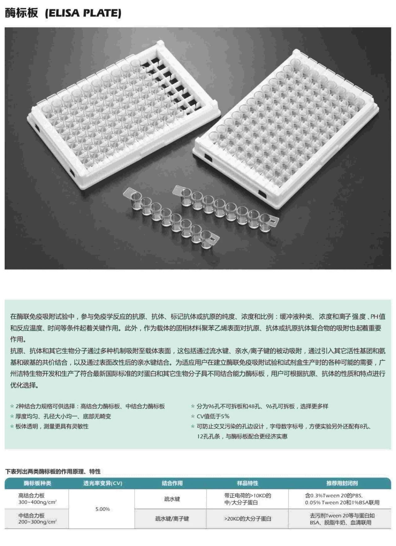 酶标板洁特 FEP101896(盒)10块/盒,20盒/箱,编号P201900003812规格96孔,高结合力可拆,配8孔条,300~400ng/cm2,10块/盒,200块/箱,整箱订购