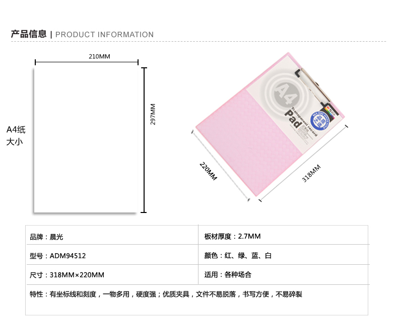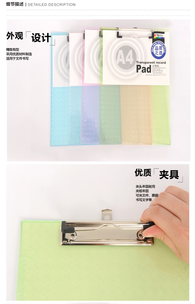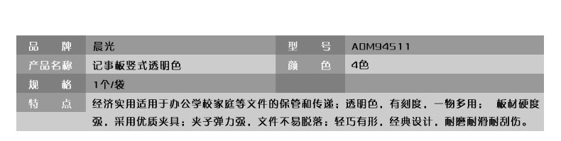 透明记事板竖式晨光 A4混色单位【个】包装【20个/中盒,120个/箱】编码【P20210916828】